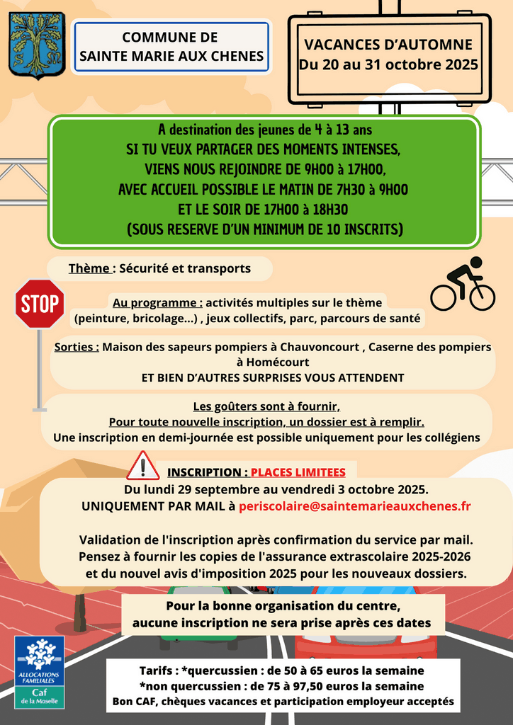 La commune organise un accueil de loisirs du lundi au vendredi pendant les vacances d'Automne (du 20 au 31 octobre 2025).